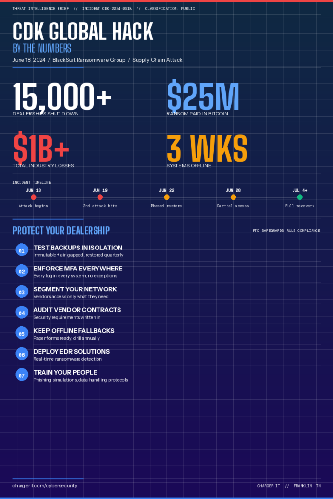 On June 18, 2024, a ransomware group called BlackSuit broke into CDK Global, the software company that runs the dealer management systems for more than 15,000 car dealerships across North America. Within hours, CDK shut everything down. Sales desks went dark. Service departments couldn’t look up repair orders. Finance managers couldn’t print contracts. And for the next two and a half weeks, thousands of dealerships were stuck doing business with pen and paper.