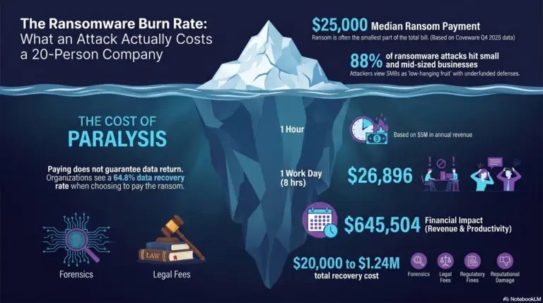 The ransom is never the real cost. Here's what a ransomware attack actually costs a 20-person company in 2025 and 2026, broken down line by line with real numbers from Sophos, Coveware, and HHS.